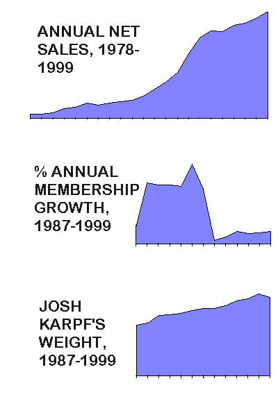 In his financial report, coordinator Mike Eakin said that the recent gross margin was 16.33% -- close to the perfect percentage of 16.67, which would be achieved when there is no "shrinkage" loss from theft or breakage. He said that a "slight inventory error" at the beginning of the year may have reduced earlier figures. (So much for blaming thieves.) He also distributed two crowded tables showing annual membership growth and net sales. Graphed here but stripped of fiscally sensitive figures, the data shows annual sales and membership growth stagnating in 1994, six years after the last building expansion began in 1988. Only sales improve after 1994. Why would sales increase despite fewer members joining a coop crowded soon after its last expansion? One explanation could be that the coop began selling more high-profit packaged and nonfood items. Another conclusion, based on the third chart showing my weight gain during the same period, is that I personally have eaten enough food to increase coop profitability.
